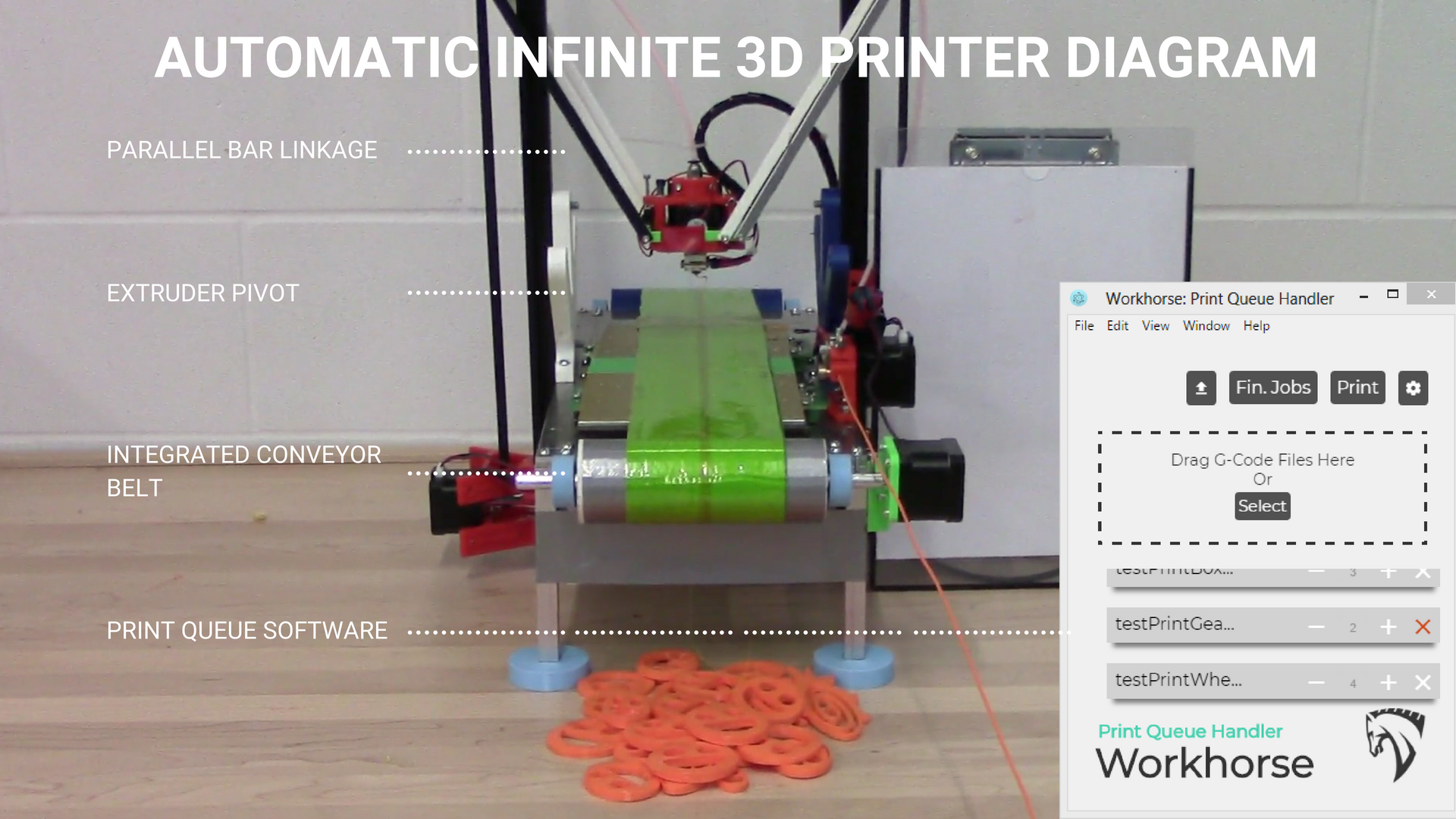 The purpose of this project is to build a fully automated 3D Printer: The Automatic Infinite 3D Printer. The Automatic Infinite 3D Printer has a conveyor belt module that autonomously ejects finished print jobs from the printer. With this novel feature, the Automatic Infinite 3D Printer is able to print a constant stream of print jobs without human intervention. This is a breakthrough for the 3D printing industry. Automatic part ejection will improve the functionality and capability of 3D printers. Within the next few years, autonomous part ejectors will be as ubiquitous to 3D printers as paper ejectors are to paper printers.