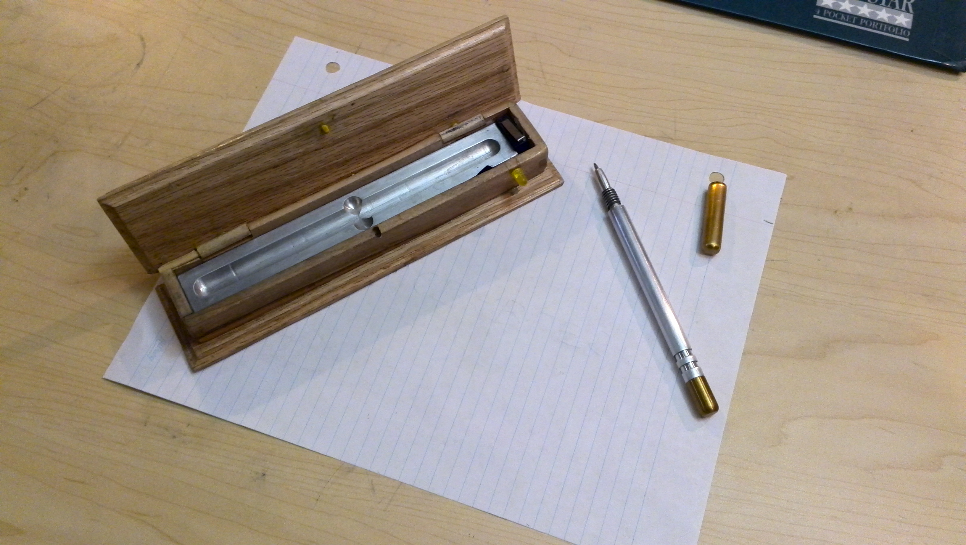 An originally designed pen machined from raw materials. Next to it is a case that lights up when closed.