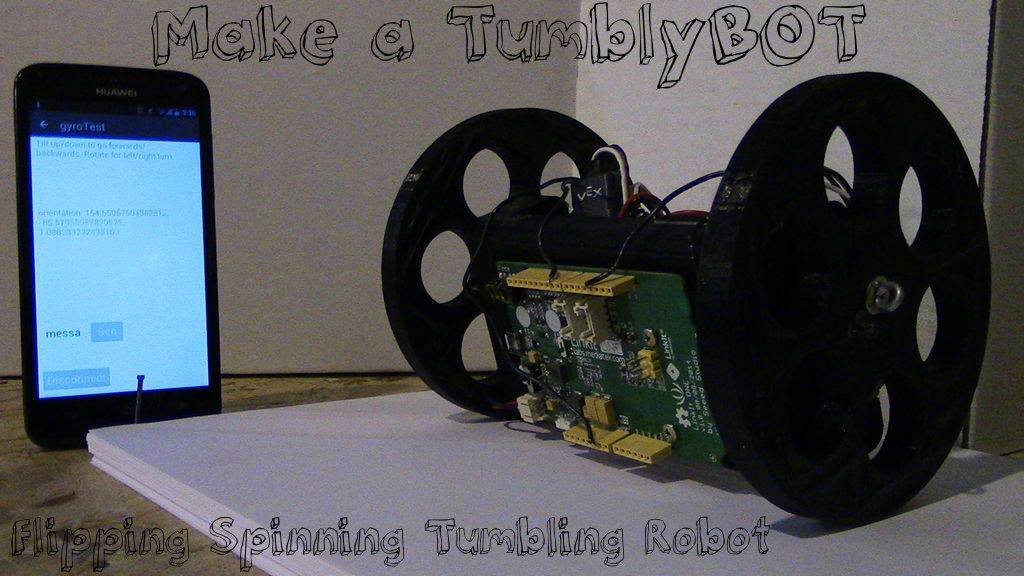 Most small robots are two motors and a castor wheel. I wanted to design a robot with a unique drive. Presenting the TumblyBOT. The TumblyBOT moves around in a cool way that is interesting to watch. Controlled by a phone's movement, TumblyBOT can roll, spin, and dare I say tumble around town.